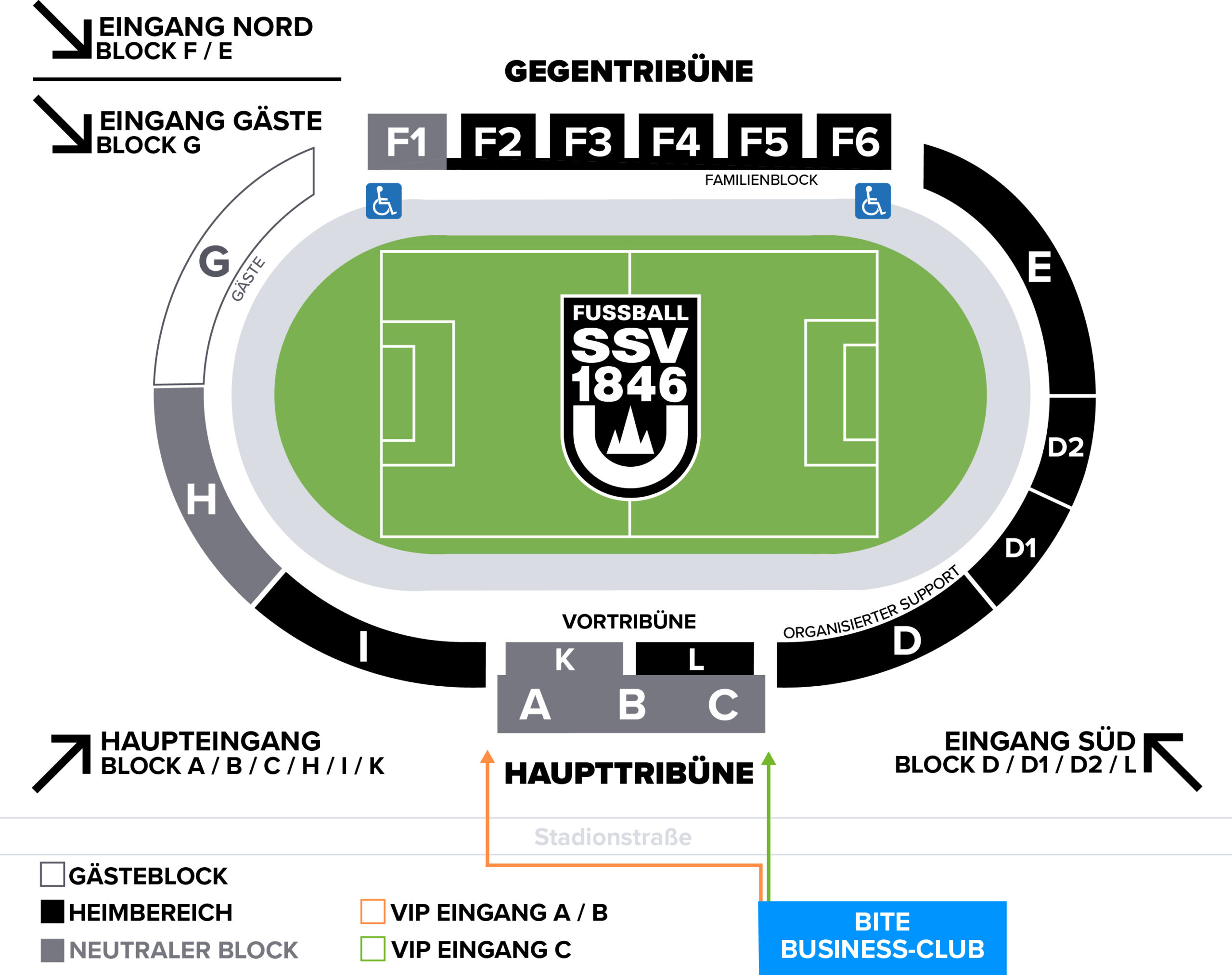Die Sitz-Blöcke A | B | C | K und F1 sind ausgewiesene neutrale Blöcke. In ausgewiesenen neutralen Bereichen ist mit einer Vermischung zu rechnen, der Einlass in Gästekleidung ist erlaubt.